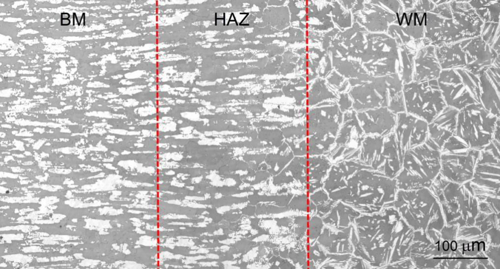 焊接過(guò)程是一個(gè)快速加熱與快速冷卻的熱循環(huán)過(guò)程。焊接接頭的組織可以分為三個(gè)部分:熔合區(qū)、熱影響區(qū)和母材。雙相不銹鋼的熔合區(qū)為鑄態(tài)組織,屬于鐵素體凝固模式,一次凝固相為單相鐵素體。焊接接頭的熱影響區(qū)根據(jù)距離焊縫熔池距離不同可分為高溫?zé)嵊绊憛^(qū)和中低溫?zé)嵊绊憛^(qū)。高溫?zé)嵊绊憛^(qū)幾乎為單相鐵素體組織,高溫?zé)嵊绊憛^(qū)的兩相比例一方面取決于鋼的化學(xué)成分,另一方面取決于焊接熱輸入、冷卻速度度等因素。中低溫?zé)嵊绊憛^(qū)基本上處于兩相平衡區(qū),在冷速較慢的情況下,可能會(huì)產(chǎn)生金屬間析出相。熱影響區(qū)晶粗大且易于產(chǎn)生析出相,大大降低了材料的沖擊性能和點(diǎn)蝕性能。